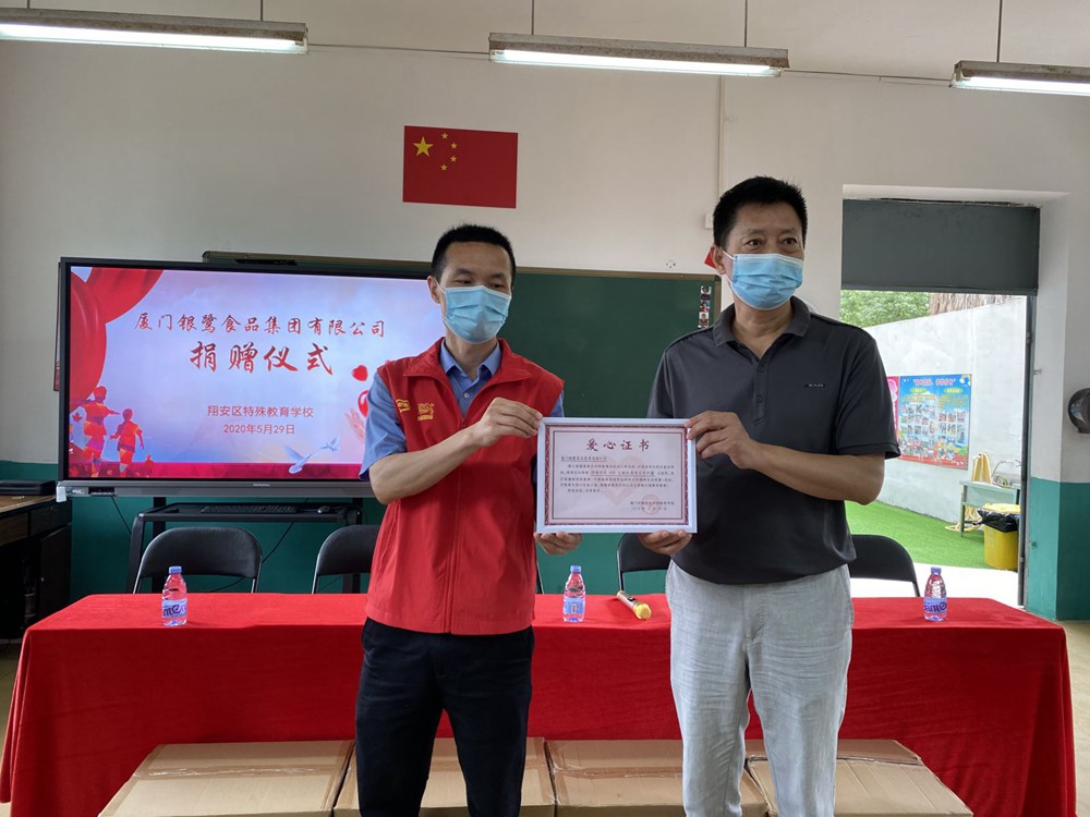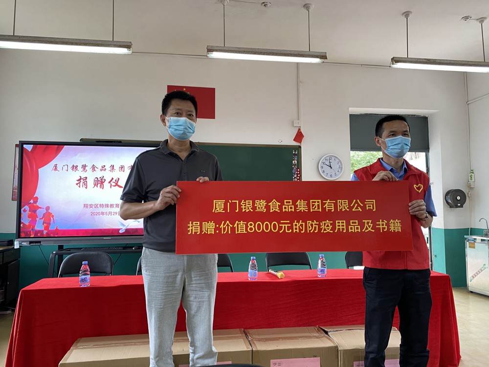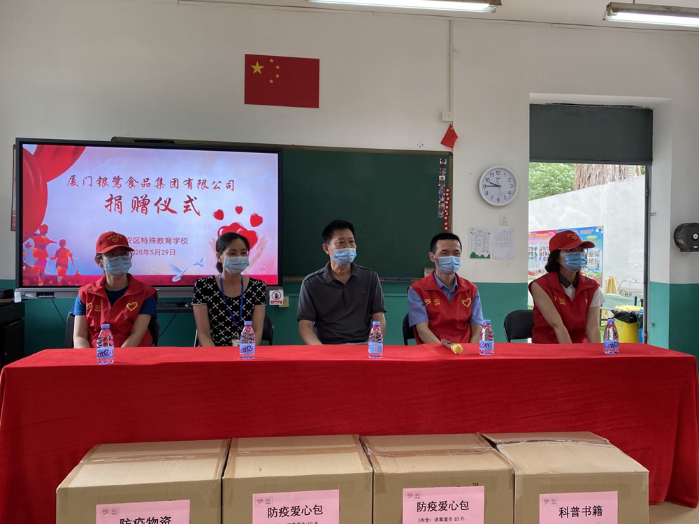 第二站,志愿者們前往同安特殊教育學校,雖然未開學,但是值班老師在崗,守護校園,井然有序地做著復學前的各項準備工作。“沒有戰勝不了的疫情,只有始終如一的愛”,銀鷺食品集團已不是第一次走進特教學校,此次攜帶愛心防疫物資,希望在疫情之下傳達暖意,溫暖童心。