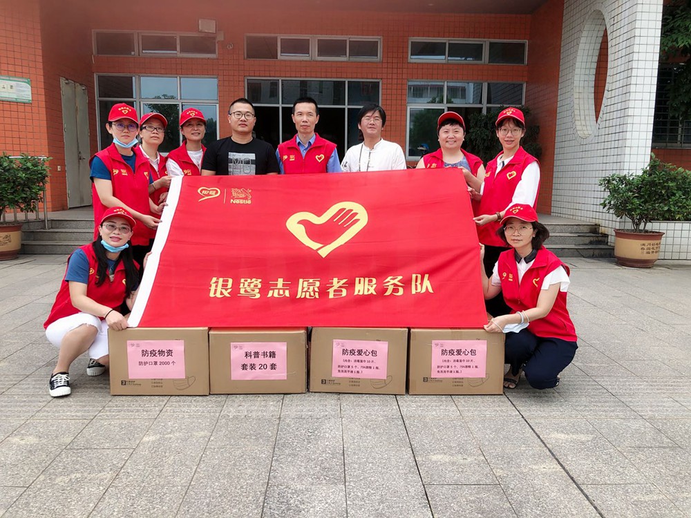 在捐贈儀式上,銀鷺食品集團捐贈價值8000元的防疫物品和科普書籍。學校為銀鷺志愿者隊伍授予愛心證書。
